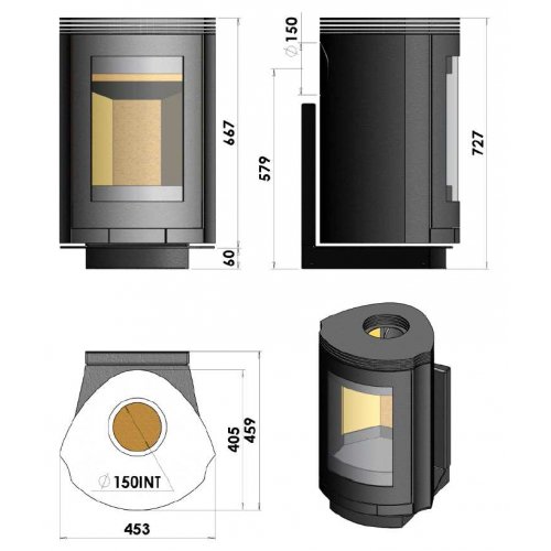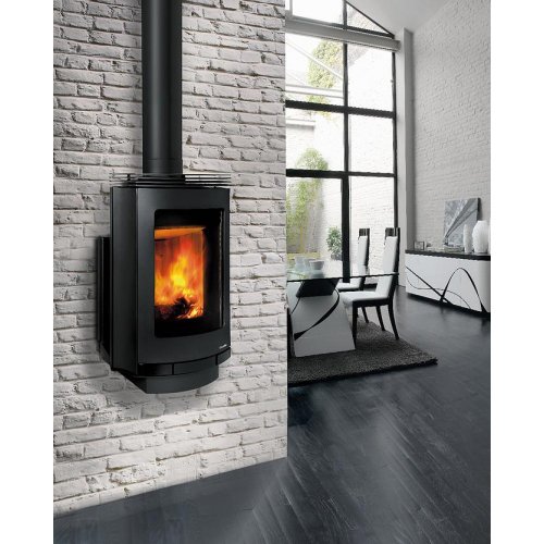 Настенная печь с корпусом из стали черного цвета. Вертикальная дверь с огнеупорным стеклом открывает красивый вид огня. В качестве топлива рекомендуется применять сухие дрова длиной до 33 см. Одной закладки дров хватает на 10 часов непрерывного горения. Данная печь оснащена системой самоочистки стекла и системой вторичного дожига. Камин так же доступен в "свободно стоящем" исполнении.